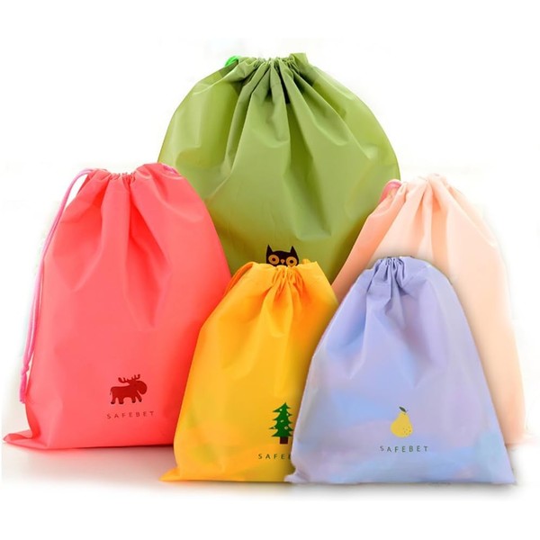 ACEmedia Set of 5 Nylon drawstring bag waterproof clothing storage bag,PE plastic folding sports home for travel storage and use,string bag, shoe bag
