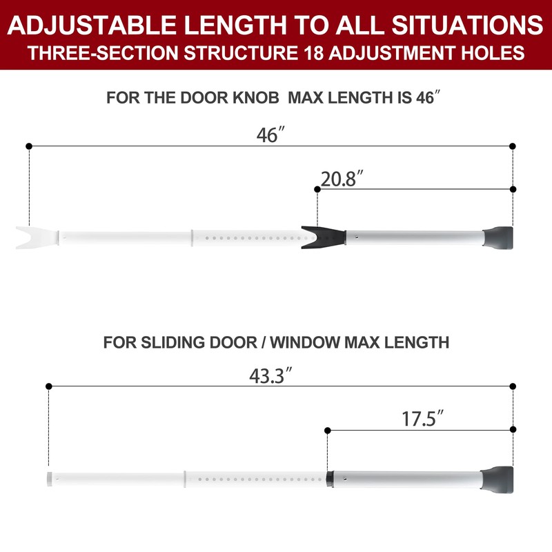 - [2-in-1 Door & Sliding Door Security Bar] Use our adjustable door security bar to deter burglars from breaking into your house, apartment, or even hotel room. The length of the door barricade security bar can be adjusted from 21 to 46inch, and the full product weighs only 2.2 pounds, making it easy to carry during travel or store at home.