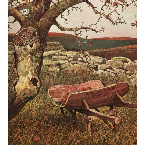 ACEO art card Apple Orchard with a old Wheelbarrow. Painted by Eric Sloane