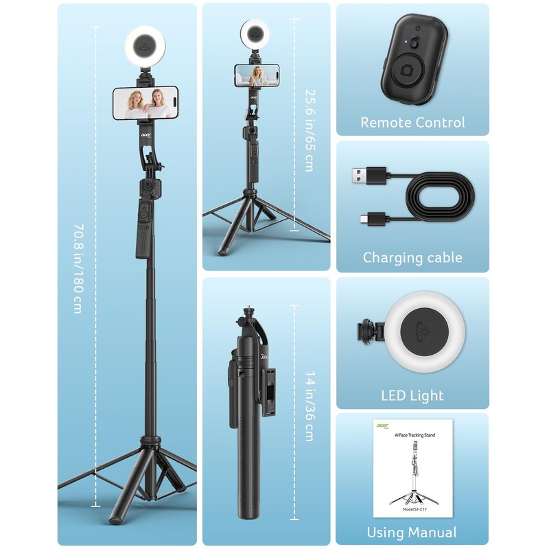 acer acer Auto Face Tracking Tripod for iPhone/Cell Phone/Android/Camera with Light and Remote, 64", No App, 360Rotating Tripod Selfie Stick for Tiktok YouTube Vlog Live Streaming Video Recording