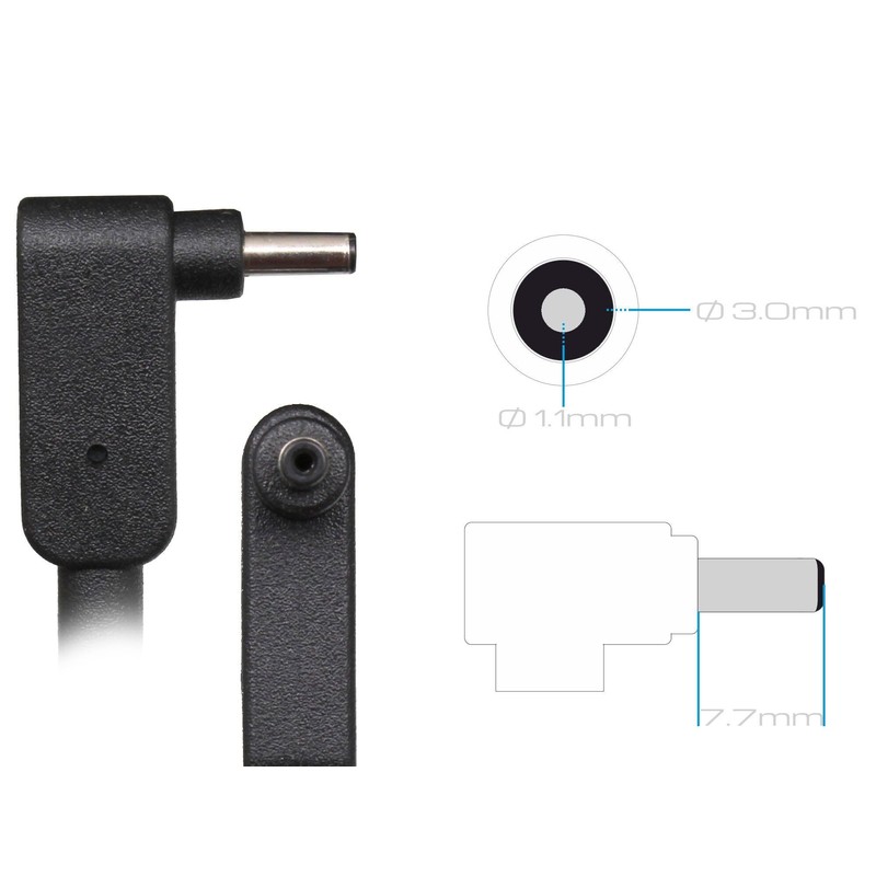 - Connector Type: Round, Connector Shape: 90° Angled, Male Outer Diameter: 3.0mm, Connector Inner Diameter: 1.1mm, Plug Length: 7.7mm, Pin in Connector: No, Length of Connection Cable from Power Supply to Notebook: Approx. 1.45 m