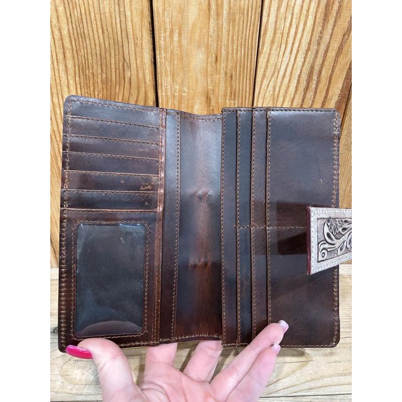 Stunning ACES leather wallet with tooled leather and cowhide accents! Snap closure. Multiple credit card slots, ID window, zipper coin pouch, and cash pockets.