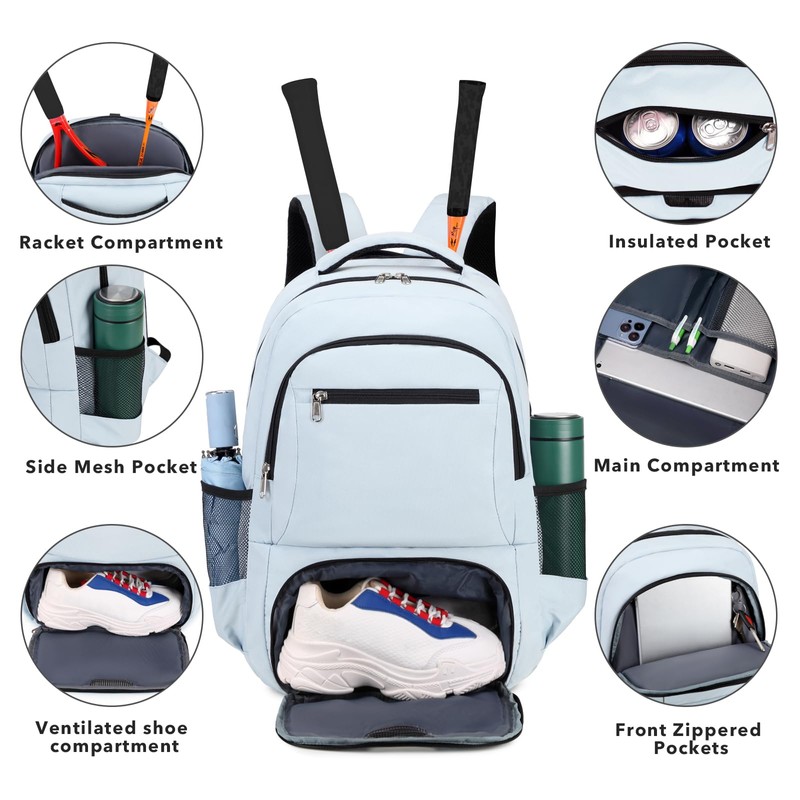 - 【Insulated Pocket】The front cooler pocket of this tennis backpack is thickened with foam and combined with an aluminum layer, allowing it to keep cold drinks for hours. The easy-to-clean waterproof lining alleviates concerns about ice melting and leaks. Additionally, you can put wet clothes or towels in this pocket of this tennis bags for men to prevent sweat stains from staining other dry items.