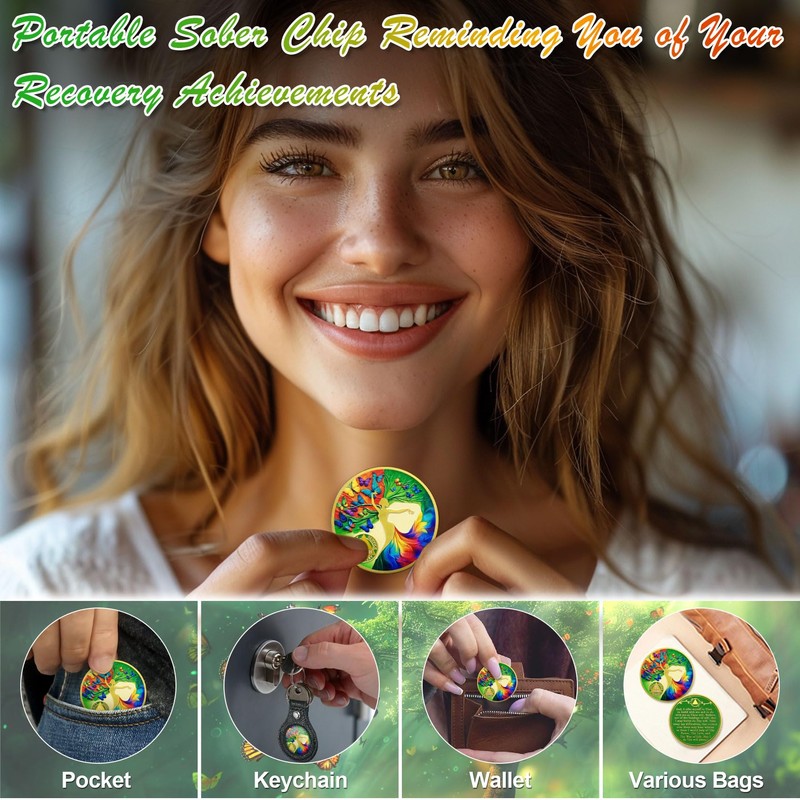 • Celebration of 9 Year Recovery: The sobriety medallion features a dancing woman transformed into a tree of life, surrounded by vibrant butterflies, symbolizing the freedom and rebirth found in recovery. It represents hope, transformation, and inner strength, celebrating the holder’s sobriety while encouraging them to keep moving forward on their recovery journey. Even through ups and downs, it serves as a reminder to find new hope and strength in every change