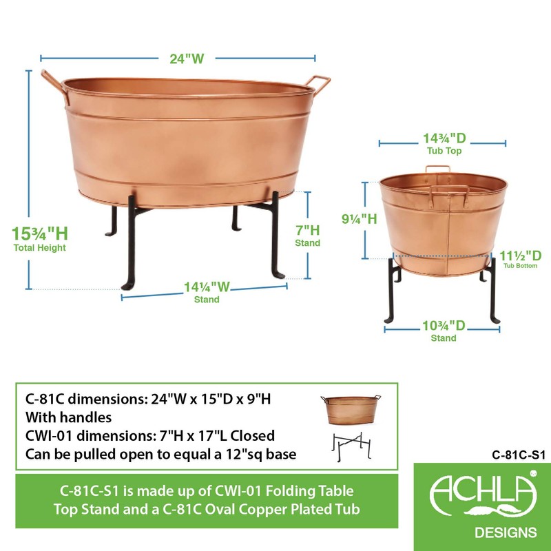 Create a container garden or use this classic vintage-style farmhouse tub as a beverage chilling station. This copper-plated Oval tub with folding wrought iron stand is stylish enough for a wine & cheese garden party or beer & soft drinks at a Casual backyard cookout. The low stand lifts the tub off the ground just enough. For planting, add drainage holes or use with flowerpots & the tub becomes a great for container for growing on patios, porches or any small space garden. Use it for salad greens, strawberries, flowers & herbs. The wrought iron folding stand lifts the container up for good drainage & air circulation, keeping decks & porches clean of plant debris & staining.