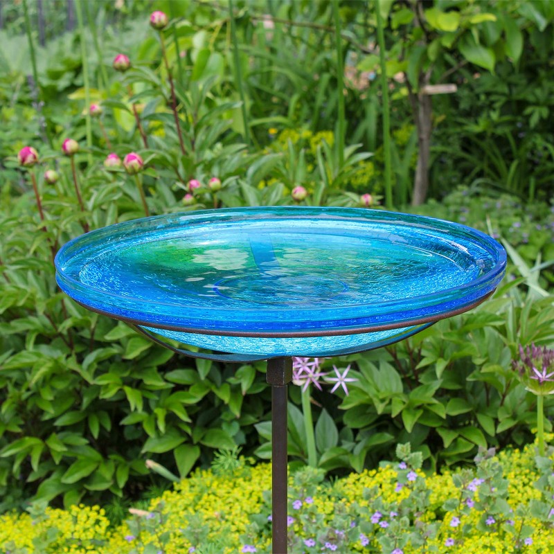 - Colorful garden decoration: reflective and brilliant, our crackled glass birdbath bowls are sparkling gems in the garden. Birds will enjoy a safe place to cool off and drink some water, and gardeners will love having this beautiful piece to accent the plantings. In five colors, These garden ornaments add a bright pop to any part of the yard. Also available with a hanging ring for deck, porch, patio or balcony.