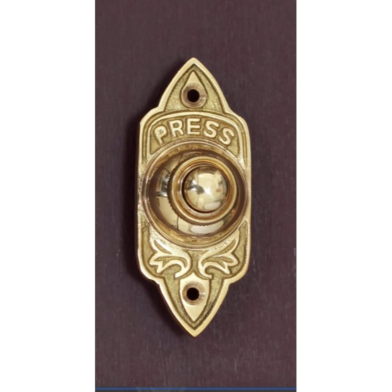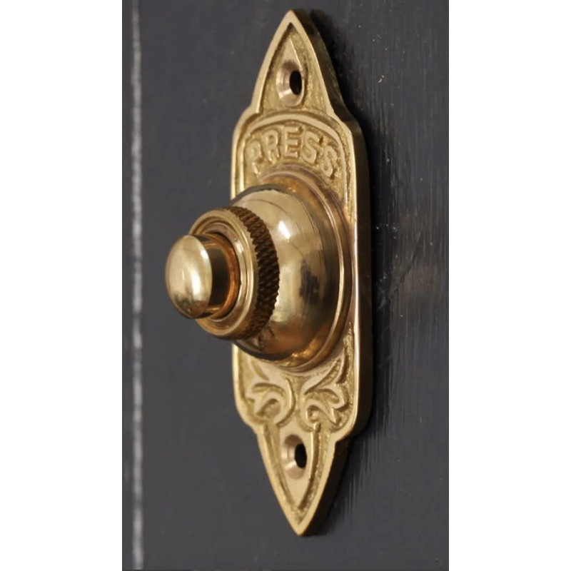 Beautifully made solid brass door bell. With classic “press” lettering cast into the top half. The Edwardian style door hardware is perfect for any rustic farmhouse premises. Very simple to install just use the brass screw terminals to attach your wires. Then fix the backing plate to wall or door frame with 2 screws (2 brass screws included) Dimensions: Back plate 75mm (3”) x 30mm (2 1/4”) projection. Button :25mm (1”) overall projection Suitable for wired door bells and chimes