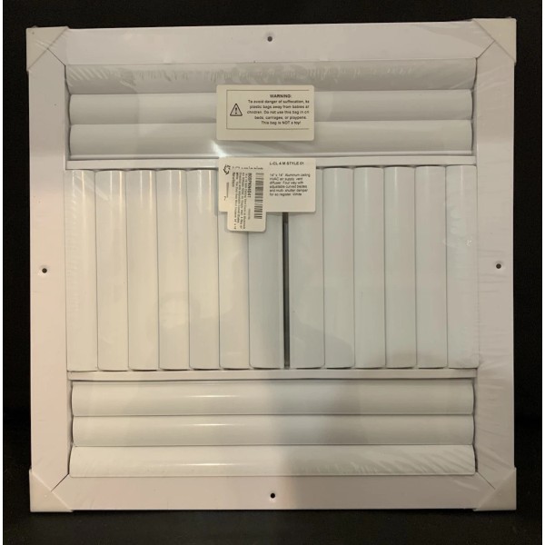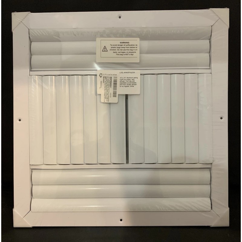 14” x 14” aluminum ceiling HVAC air supply vent diffuser. 4 way with adjustable curved blades and multi shutter damper for AC register. White color. The duct hole must be 14” x 14”