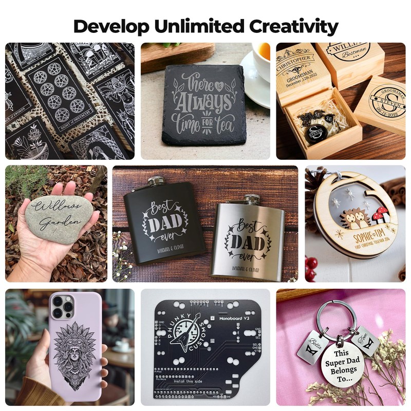 - Lightweight, Durable & Portable Design: Built from industrial-grade aluminum alloy, the 2kg compact engraver is easy to carry and store. With a 130x130mm working area and machine size of 250×250×162mm, it's optimized for home use without sacrificing pro-level performance.