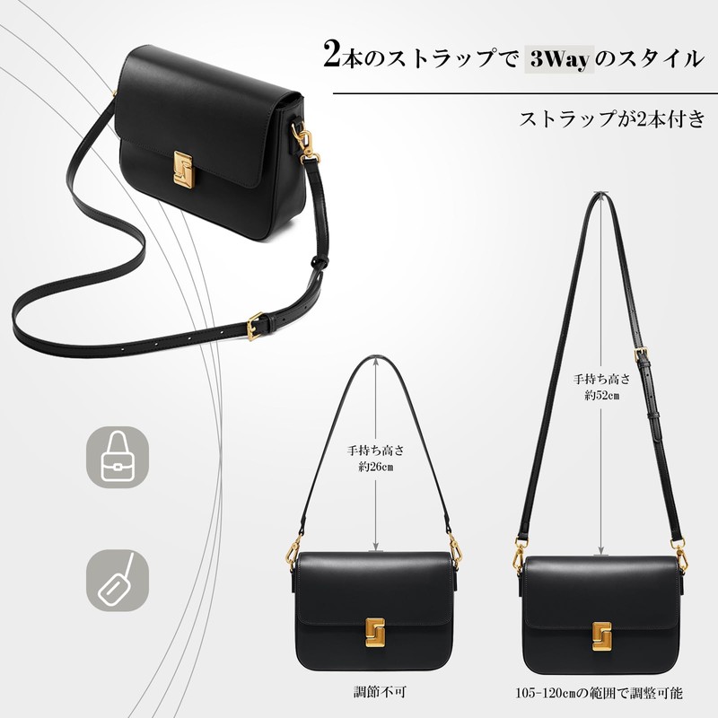 - 2-way style genuine leather bag. Comes with 2 long straps (adjustable 41.3 - 47.2 inches (105 - 120 cm) and short straps (25.6 inches (65 cm) fixed). The long strap can be adjusted to 5 levels with sliding hardware (41.3 - 47.2 inches (105 - 120 cm). This multi-functional design is popular among women that can be worn diagonally, shoulder or handbag. High quality spring hook attachment on strap ensures secure closure and smooth removal. The elegant texture of genuine leather will blend with any style