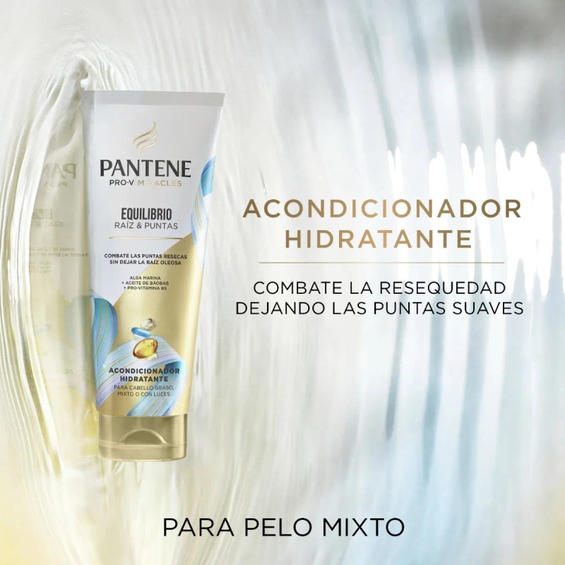 ¿Pelo graso y puntas secas? ¡La tortura de tener cabello mixto se acabó! La Colección Pantene Equilibrio Raíz y Puntas con algas marinas, aceite de baobab y pro-vitamina B5 limpia las raíces e hidrata las puntas, sin dejarlo pesado. El acondicionador para cabello mixto y/o teñido de Pantene Equilibrio Raíz y Puntas penetra las puntas secas y maltratadas, dejándolas ligeras, hidratadas y sin frizz; contiene glicerina, que facilita el enjuague y lo deja suave y brillante.