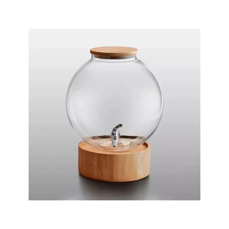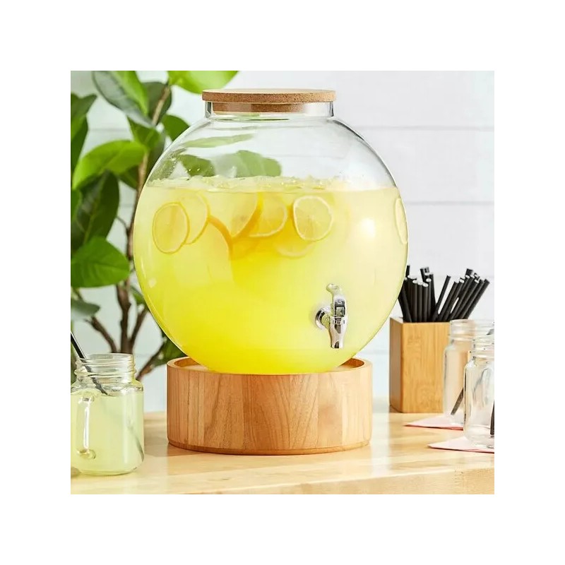 Its attractive, round design is sure to enhance your beverage service and add an elegant touch to your venue. Use it to serve your signature lavender lemonade, homemade iced tea, or even handcrafted sangria. It's perfect for both indoor and outdoor events thanks to its simple, classic design. This dispenser's trendy wood base elevates and accentuates the beverage dispenser for simpler pouring.