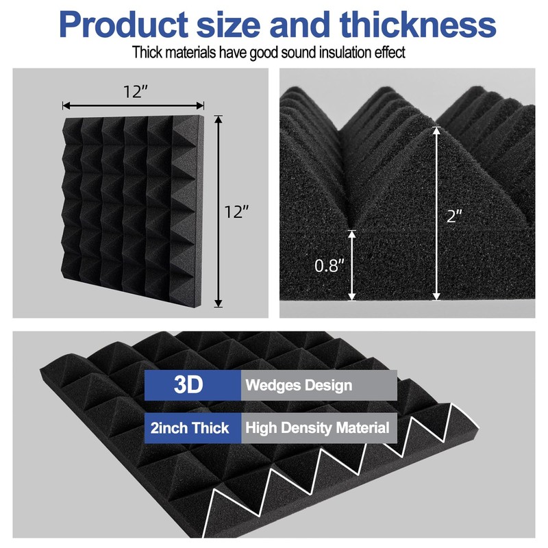 - Effective Acoustic Treatment - The Acoustic Foam Panels feature a 3D pyramid-shaped design with a thickness of 2 inches, effectively blocking and absorbing unwanted echoes, waves, reverberations, and tremor echoes, resulting in better recording results.