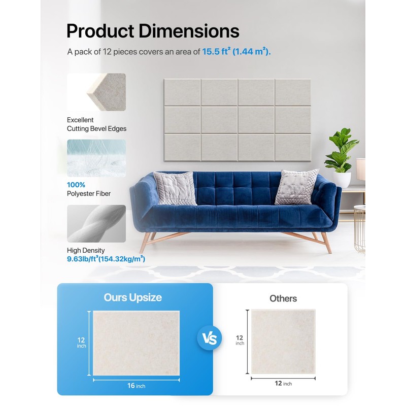 - Coverage Area: Acoustic panels cover 16 ft²; acoustic wall panels feature a 45° beveled edge design; seamless installation without gaps for an aesthetically pleasing appearance