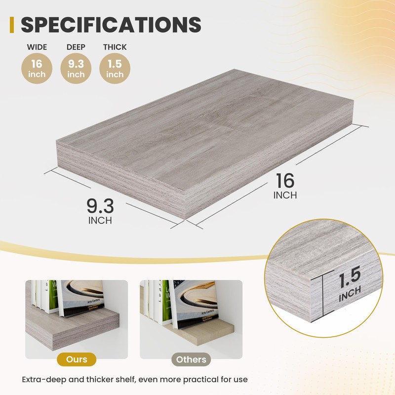 - [SPACIOUS STORAGE SOLUTION]: Featuring an ample 9.3 inch depth, these deep floating shelves offer generous space for decor and essentials. Their wide surface can accommodate books, photos, plants, and more, providing a stylish and practical display. At 1.5 inches thick, they add visual weight and depth, making them a functional focal point on your walls.