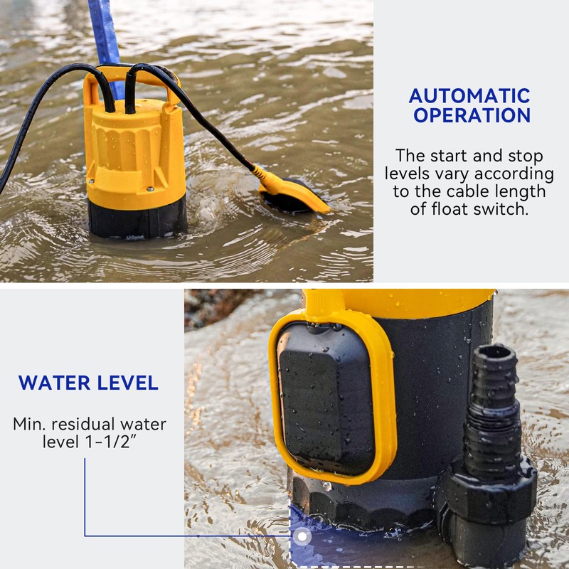 • Auto & Safe Operation: Adjustable float switch turns on/off the pump automatically by the water level. For low water level, keep the switch upright to allow manual operation (plug it in to play; unplug to stop). 19.7ft UL power cord provides safety and convenience with max. immersion depth 13ft