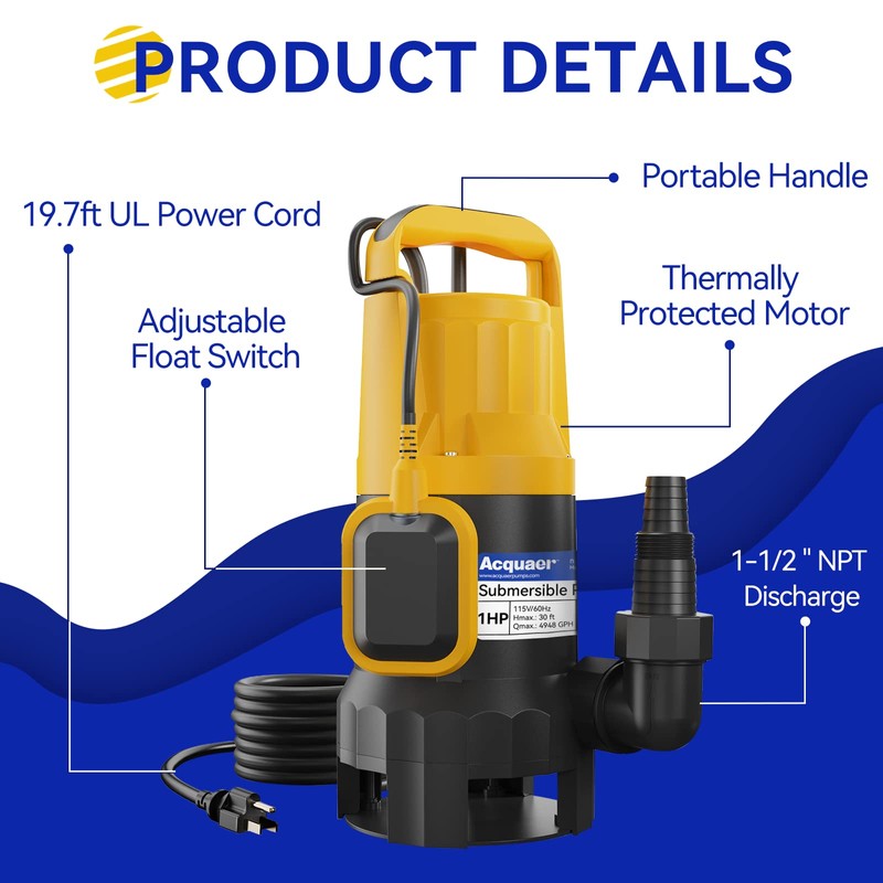 Acquaer 1HP Sump Pump 4948GPH Submersible Drain Pump with Automatic Float Switch, Remove Clean/Dirty Water for Basement, Hot Tub, Pools, Garden Pond