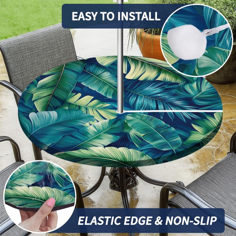 - [UNIQUE FRESH STYLE DESIGN]: The green palm leaves design of the round patio table cover allows you to feel the nature at home, and this famously designed tablecloth is suitable for most styles of home tables and various forms of occasions.