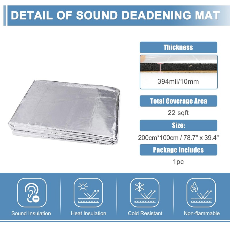 - Note: Please check if the mat size is enough for your installation position before buying. Number of sheets: 1pc. Mat Size: 200cm*100cm / 78.7" x 39.4", Total Coverage Area: 22 sqft, Thickness: 394mil/10mm