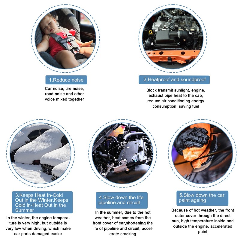 - Feature: Sound damping pad with heat shield design. The surface is glassfiber. Heatproof. Block transmit sunlight, engine, exhaust pipe heat to the cab, reduce air conditioning energy consumption, saving fuel. Keeps your car stay cooler in the summer and warmer in the winter.