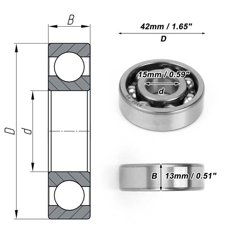- Specification:Outer Diameter: 42mm / 1.65", Inner Diameter: 15mm / 0.59", Width: 13mm / 0.51", Type: 6302 &, Precision Level: P5, Basic Load Ratings (kN): Cr:12 C0r:5.45, Limiting Speeds(min-1): Grease:19000 Oil:24000
