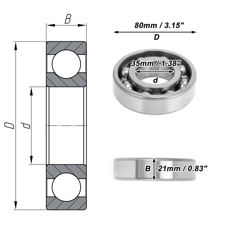- Specification:Outer Diameter: 80mm / 3.15", Inner Diameter: 35mm / 1.38", Width: 21mm / 0.83", Type: 6307, Precision Level: P0, Basic Load Ratings (kN): Cr:33.5 C0r:19.2, Limiting Speeds(min-1): Grease:8500 Oil:10000