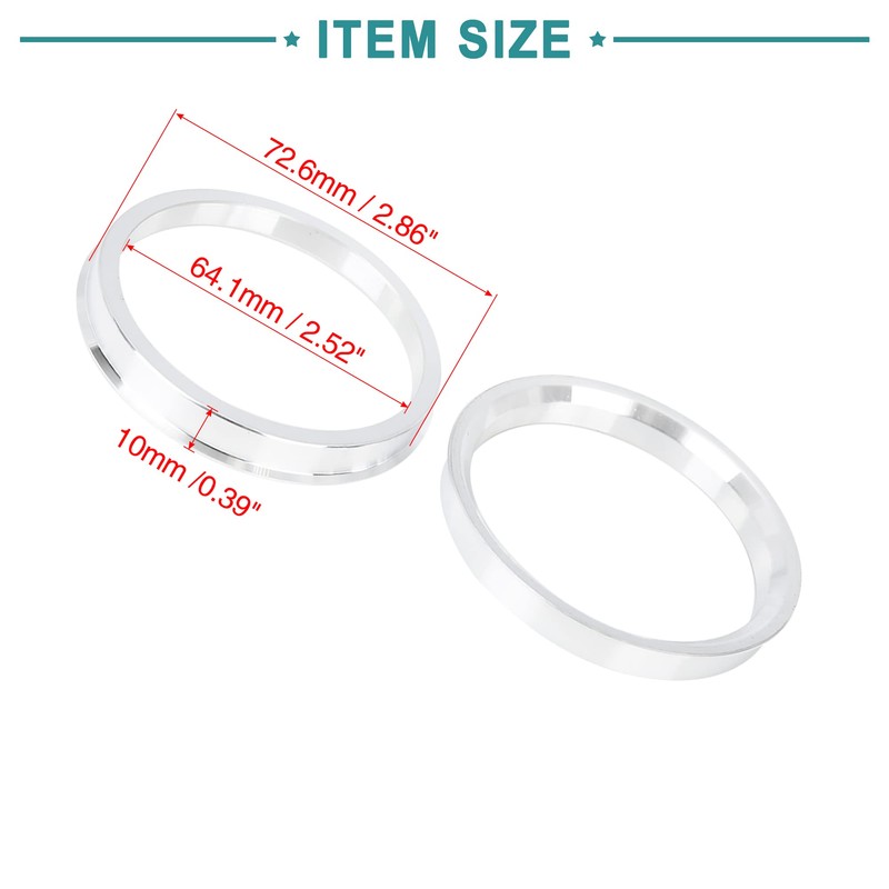 • Direct Fit to prolong the Hubcentric Rings life time. Size: Fit for any Vehicle with a 64.1mm Hub that Needs to Adapt a Wheel with 72.6mm Center Bore (OD=72.6mm ID=64.1mm)