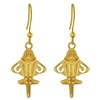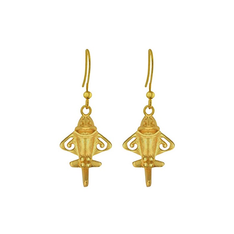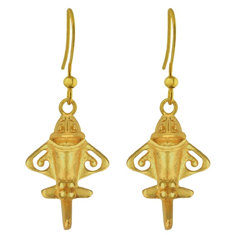 24k gold plated dangle earrings. Pre-Columbian museum reproduction ornament from the Quimbaya-Tolima cultures. Ancient Golden Jets Collection. Handcrafted in Colombia. Golden Jet model ZF003