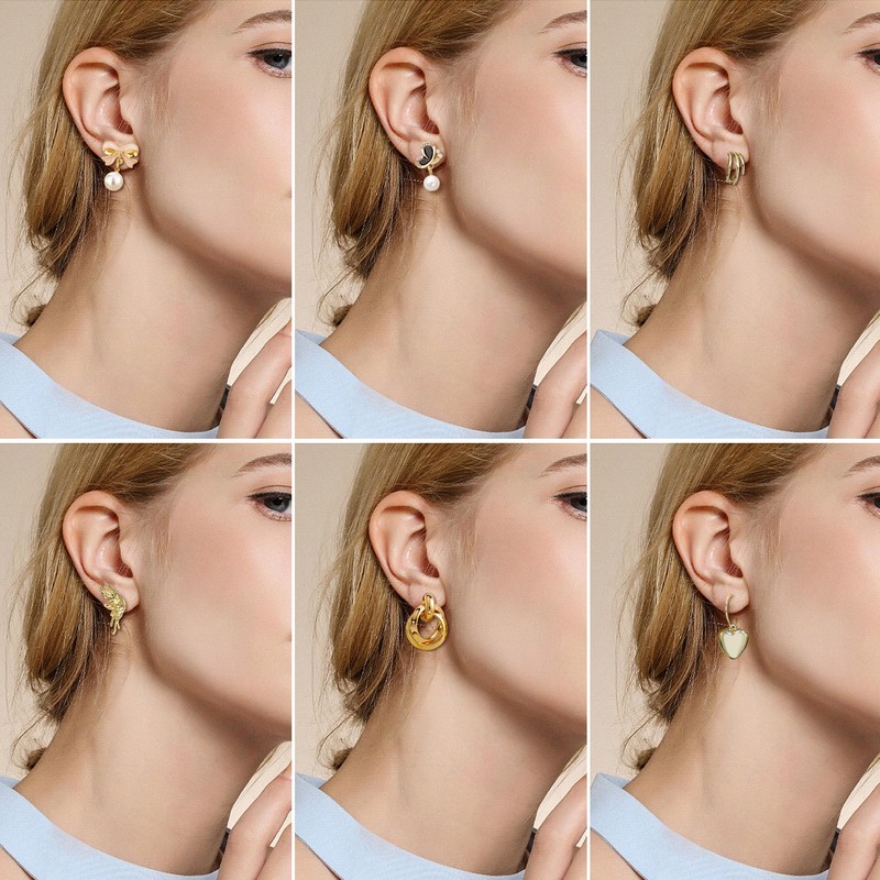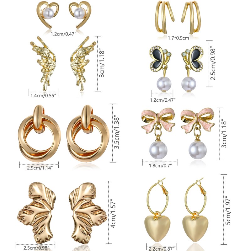 - Gold Stud Earrings for Women: You will get 8 pairs gold stud earrings of various types in one order, such as cute bow earrings, heart pearl earrings, butterfly pearl earrings, heart dangle earrings and chunky gold knot earring, more choice for daily wearing.