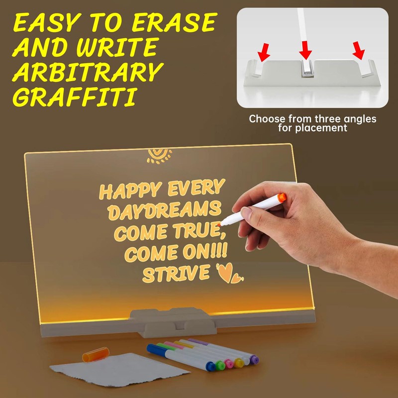 - 【Tägliche Erinnerung】 Als Acryl-LED-Schreibtafel für Nachrichten, schreiben Sie Ihren Arbeitsplan, Ihren Studienplan oder Ihre To-Do-Liste auf, hinterlassen Sie eine Nachricht an Ihre Familie, Kollegen oder Freunde, die auf dem LED-beleuchteten Nachrichtenbrett vorgestellt werden. Ich denke, sie werden Ihre Nachricht bald bemerken. Es kann auch als Zeichenbrett verwendet werden. Bitte verwenden Sie 7-farbige Stifte, um Ihre Lieblingskunstwerke zu zeichnen, und es kann auch als kleine Tafel verwendet werden, um zu beschreiben, was Sie brauchen, um durch Licht auszudrücken.
