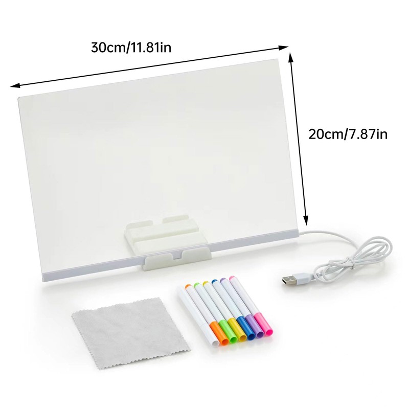 - Trocken abwischbare Acryl-Tafel mit Licht: 30 x 20 cm, trocken abwischbare Acryl-Tafel mit Lichtern. Hergestellt aus transparentem Acryl, mit einer Oberfläche ohne Spuren und kristallklar, sorgen für einfaches Schreiben und Löschen. (Schutzfolie kann diese transparente Trockenteller vor Transportkratzern schützen - vor Gebrauch entfernen).