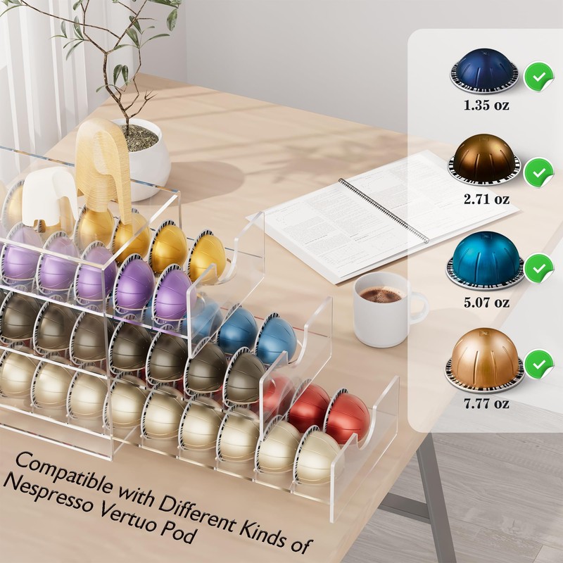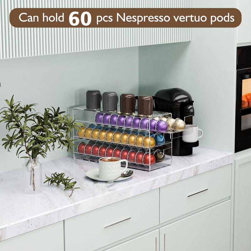 - Upgrade your coffee pod organization with the BXINREDA 3-tier Coffee Pod Drawer! This acrylic drawer is designed to hold 60 pods, providing a clear and neat storage solution for your Nespresso Vertuo pods.