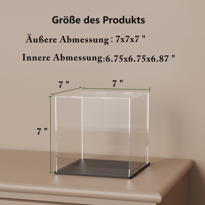 - Display box size (length x width x height): external dimensions 7 x 7 x 7 inches; inner dimensions 6.76 x 6.76 x 6.88 inches. Other sizes in landscape and portrait format are available from us.