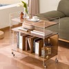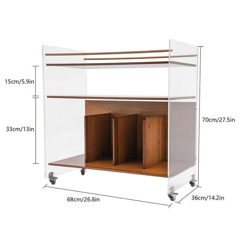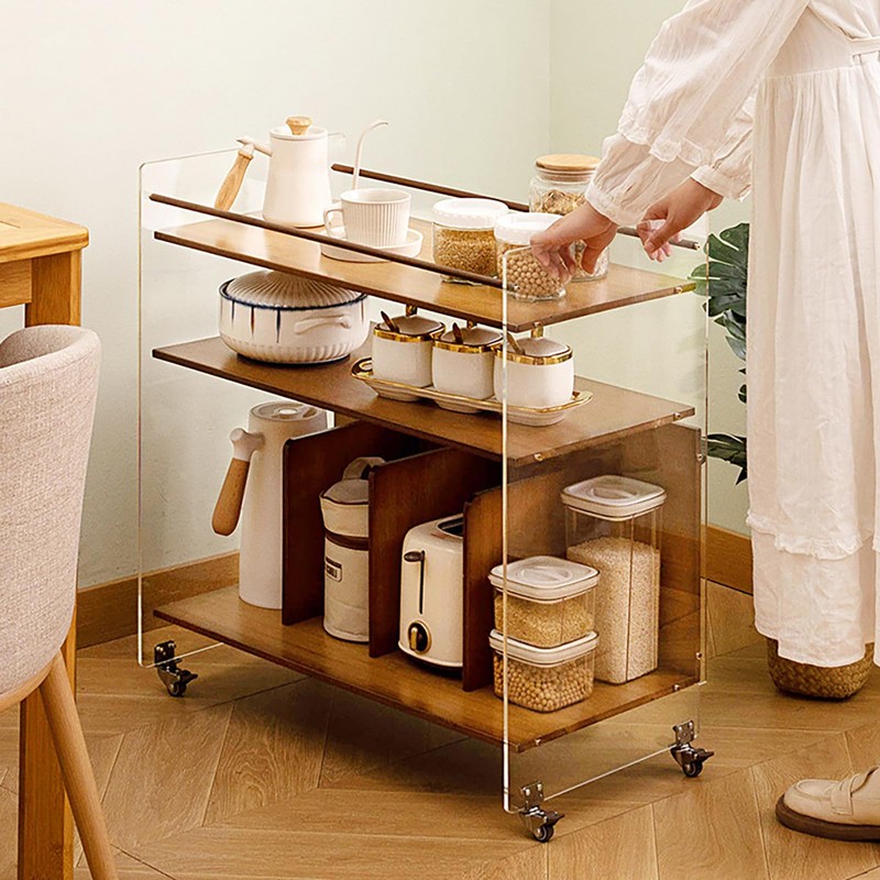 Acrylic End Table with Wheels, 3-Tier Clear Sofa Side Table Modern Coffee Table with Open Bamboo Storage Shelf, Rolling Storage Acrylic Cart Home Decor Nightstand for Living Room Bedroom (Tawny)