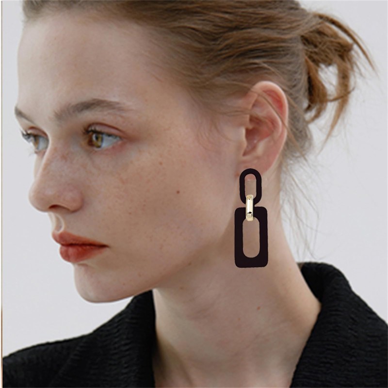 - The earrings are made of two hollowed-out ovals, one large and one small. The upper and lower parts are connected by a gold buckle. The design is stylish and elegant, unique and charming, and will make you very attractive when wearing it.