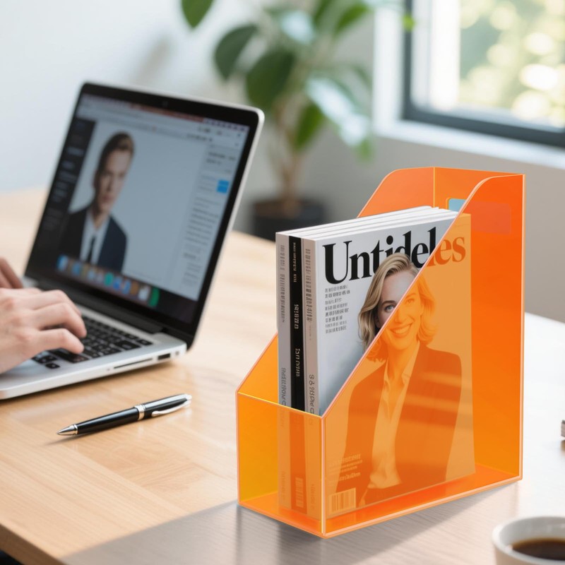 Acrylic Magazine Rack Desk File Holder Organizer for Office Desktop Vertical Magazine Storage Box, 12 x 10 x 5'', Neon Orange