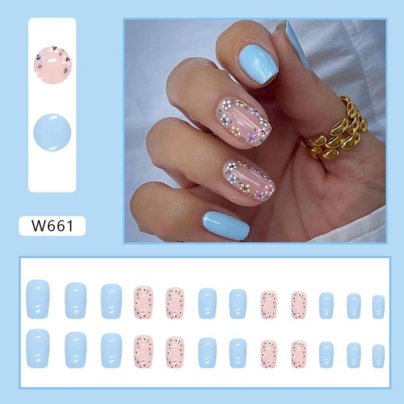 24Pcs Short Press on Nails Square with Colorful Small Floral Designs French Charm Fake Nails Set for Women Manicure Decorations.