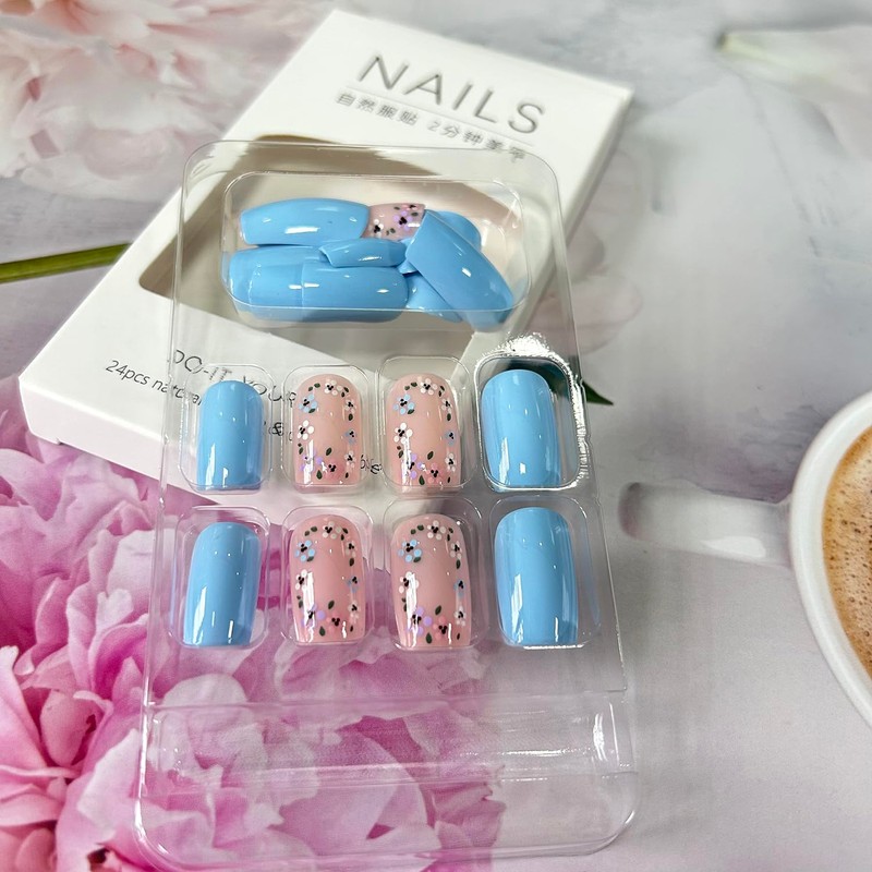 Acrylic Press on Nails Short, Artificial Square Shape Fake Nails with Colorful Flowers Designs, 24 pcs Blue Full Cover Reusable Coffin Glossy False Nails, Stick on Nails for Women, Glue on Nails Set