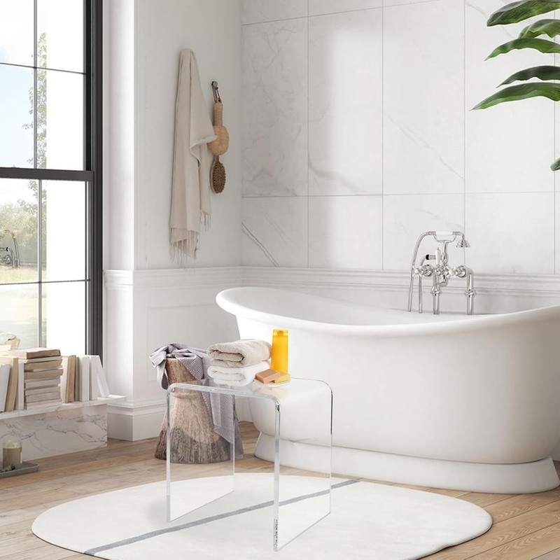 - 3. 【Multi-Functional Acrylic Stool】 Works as a shower chair for elderly, vanity seat, or tub-side stool. Perfect for pools (outdoor shower stool), cafes (bar stool), galleries (display stand), or camping trips (lightweight & portable)