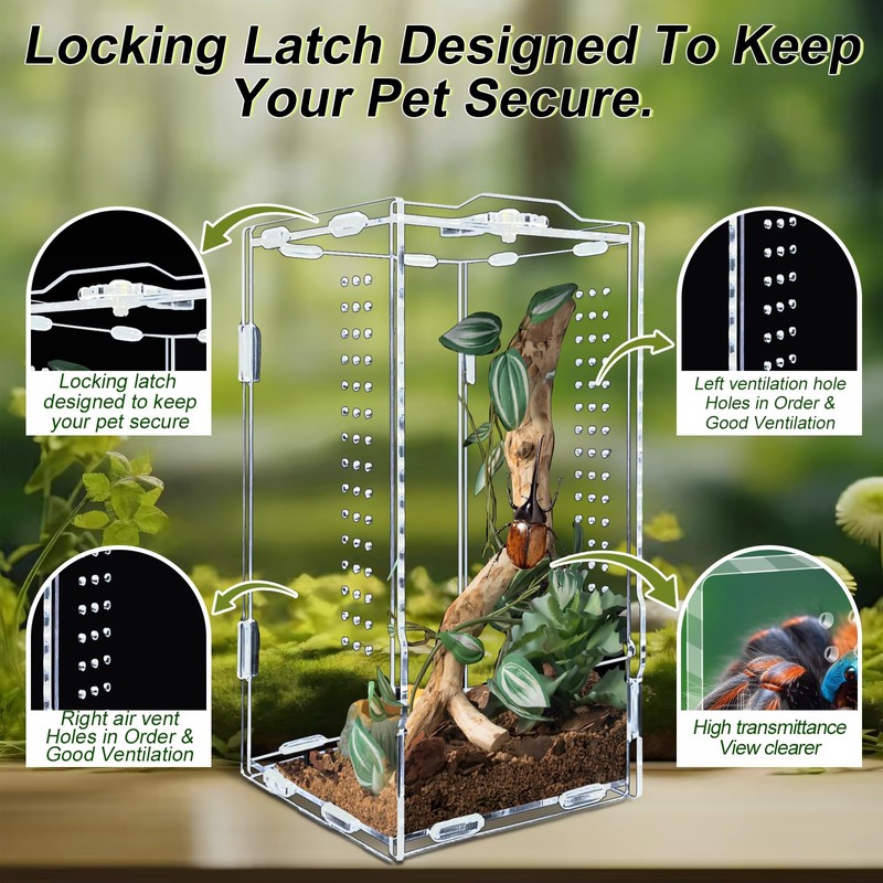 - 🐌 Versatile Application: Designed for both terrestrial and arboreal species, our acrylic terrarium caters to a diverse range of small reptiles, amphibians, spiders, and invertebrates. From insects and fish to tarantulas and hermit crabs, this enclosure is perfect for housing a variety of pets including iguanas, tortoises, leopard geckos, frogs, and bearded dragons.