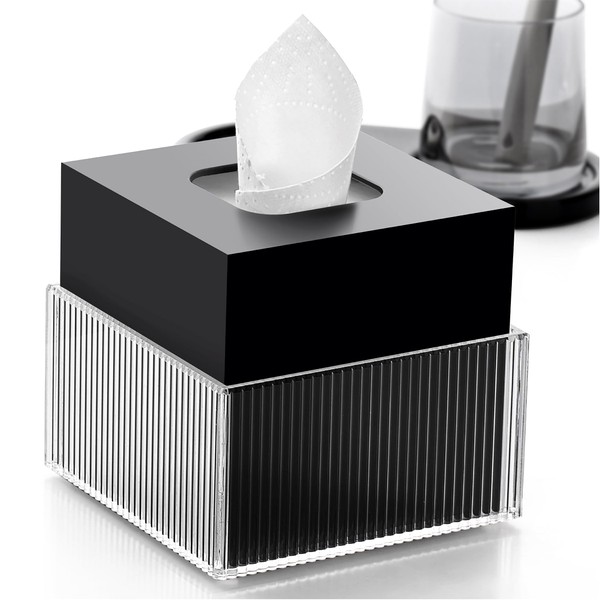 - Modern Matte Black & Ripple Design:Upgrade your space with a sleek square tissue box cover featuring sharp edges and dual-tone aesthetics. The fingerprint-resistant matte black acrylic top pairs with a clear rippled base, blending minimalist style with functional elegance for offices and modern homes.