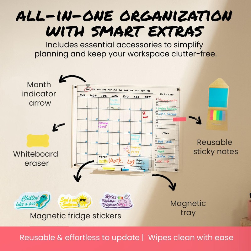 - ● Complete Accessory Kit – This dry erase calendar includes a magnetic tray for easy marker storage, whiteboard eraser for spotless cleaning, and 4 liquid chalk markers (red, black, blue, green) for color-coded organization. Also features a detachable month indicator arrow, reusable sticky note pad for flexible reminders, and fun magnetic fridge stickers to brighten up your space. It’s the perfect addition to your acrylic calendar on your wall.