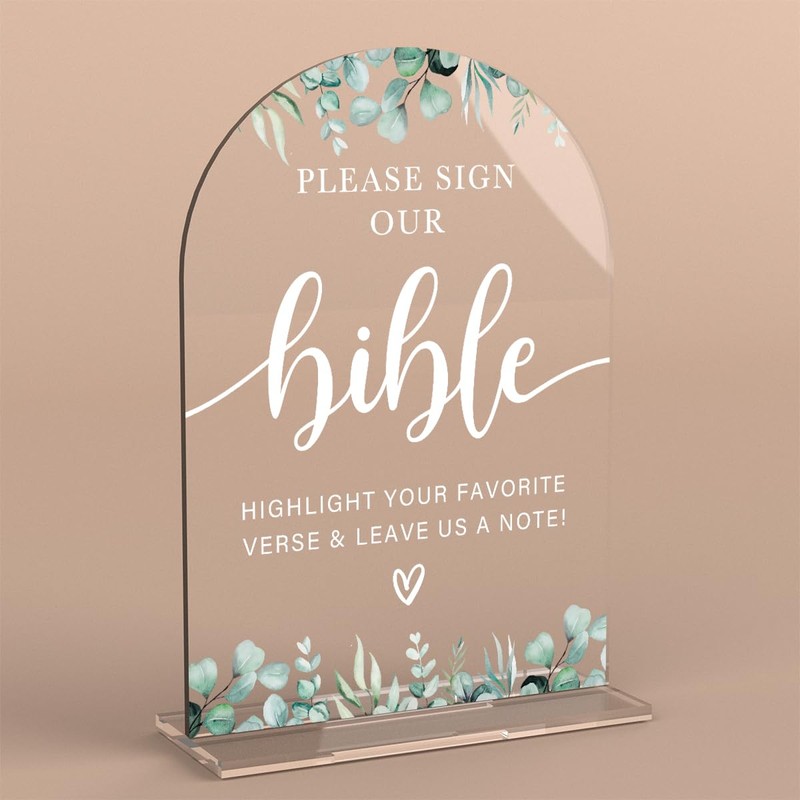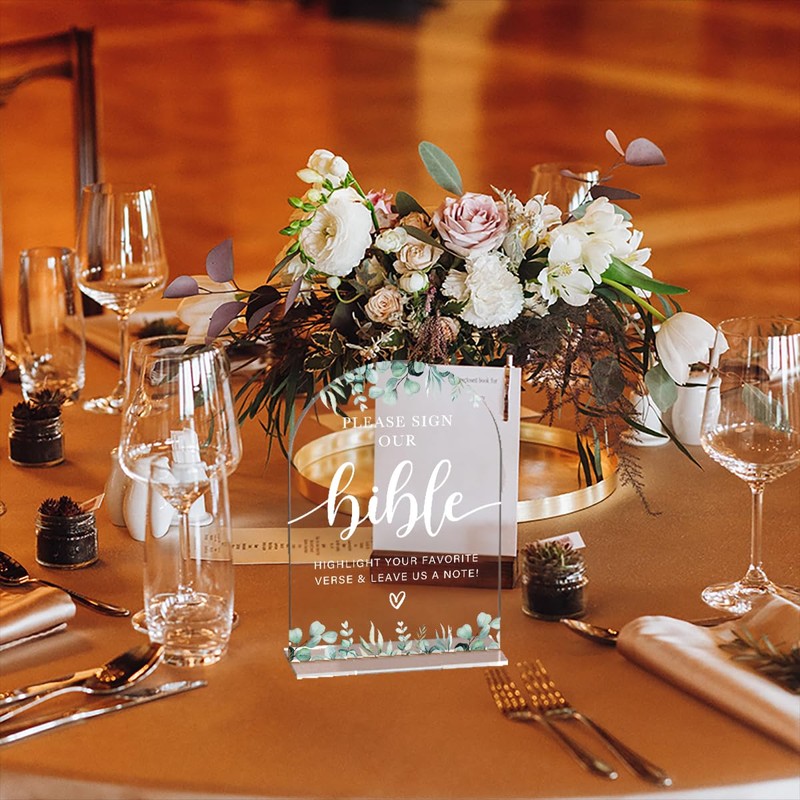 Acrylic Wedding Sign Please Sign Our Bible Signs for Ceremony Modern Calligraphy Arch Acrylic Table Top Signs for Wedding Reception and Event Party Table Decor (Eucalyptus Leaves)