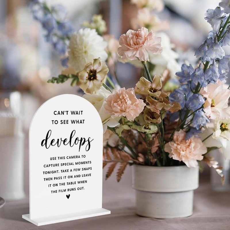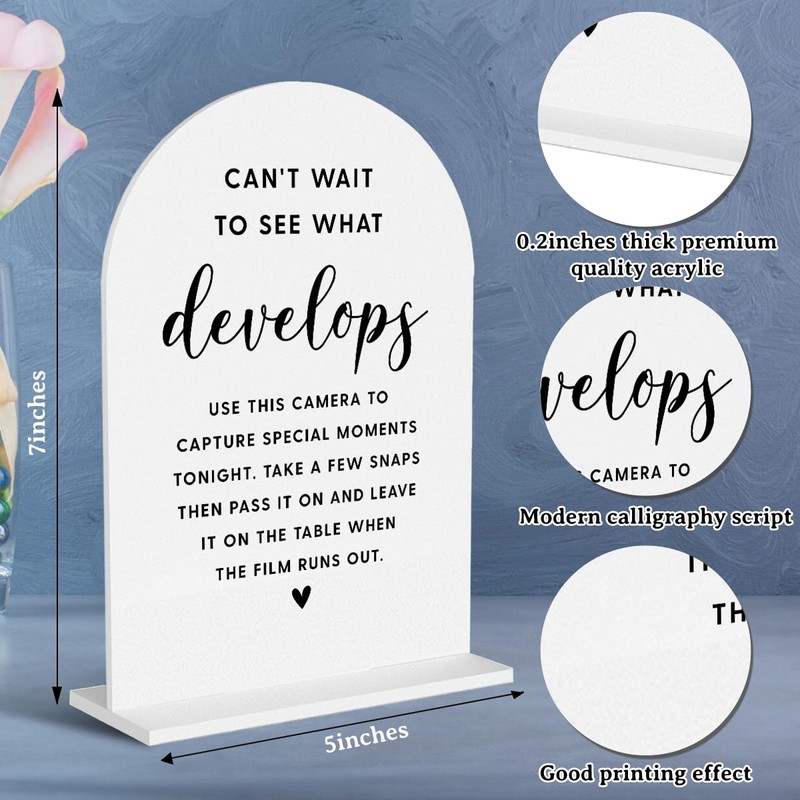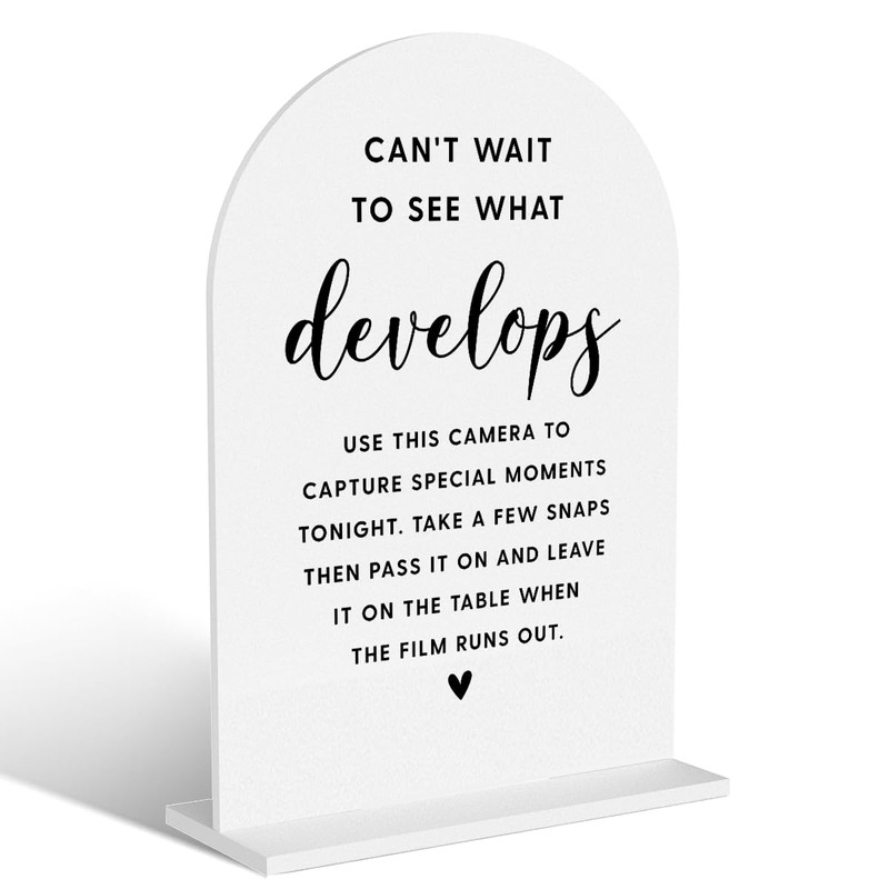 Acrylic Wedding Signs, Bridal Shower Decorations, Modern Arched Round Top Acrylic Table Top Sign with Holder for Wedding Reception Party Dinner - Can't Wait to See What Develops (White)