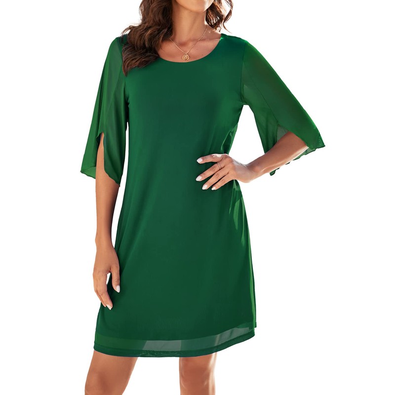 Actcat Women Casual Ruffle Dress 3/4 Sleeve Mesh Dress Loose Flowing Stretchy Elegant Evening Dress, 02 Dark Green