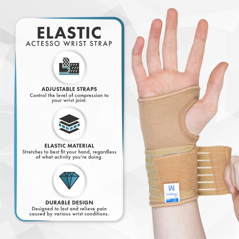 Actesso Elastic Wrist Support With Strap - Ideal for Sprains, Injury or Tendonitis with no metal bar - Support without inhibiting flexibility | Left or Right (Beige, L (Pack of 1))