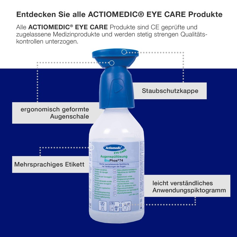 - High quality: all ACTIOMEDIC eye care products are approved medical devices under strict quality controls. This phosphate-buffered eye wash solution 4.9% complies with DIN EN 15 154-4 and has a shelf life of 3 years.