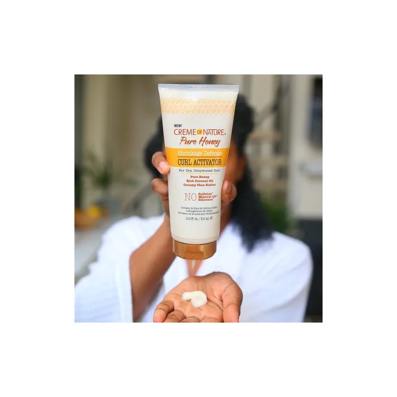 Creme of Nature Pure Honey Shrinkage Defense Curl Activator es un producto diseñado para combatir la contracción en cabellos secos y deshidratados. Libre de sulfatos, aceites minerales y siliconas, esta fórmula está enriquecida con una mezcla de Miel Pura, Aceite de Coco Natural y Manteca de Karité. Es ideal para hidratar intensamente, suavizar y proporcionar la suavidad necesaria sin apelmazar el cabello. Ayuda a definir y alargar los rizos, creando rizos suaves y elásticos, además de aportar brillo.
