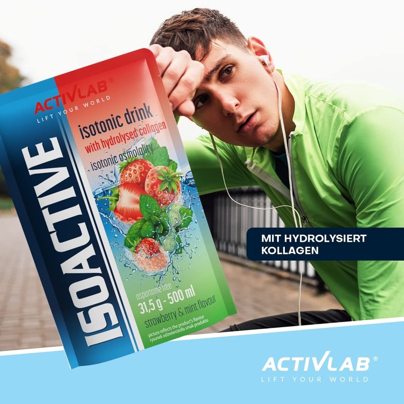 Activlab Isoactive Isotonic Drink with Hydrolyzed Collagen Electrolytes B Vitamins 20 x 31.5 g Strawberry Mint 500 ml Sports Drink Practical Bag 3 x Laboratory Tested