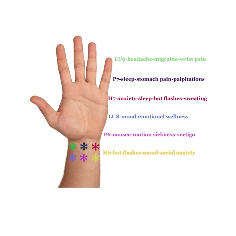H7-sleep issues, irritability, stress, mood, nervousness, anxiety, hyperactivity, palpitations, fear, and forgetfulness. P7-sleeplessness, stress, hot flashes, mood, palpitations, sweating, stomach pain, and vomiting. LU9-palpitations, stress headaches, nervousness, poor circulation, headache, migraine, and wrist pain. H6-anxiety, irritability, hot flashes, night sweats, panic attacks. P6-VERTIGO, nausea, motion sickness, morning sickness, carpal tunnel. LU8-emotional well-being, mood support. Top of wrist: TW4/TW5-rheumatism, tendinitis, carpal tunnel.